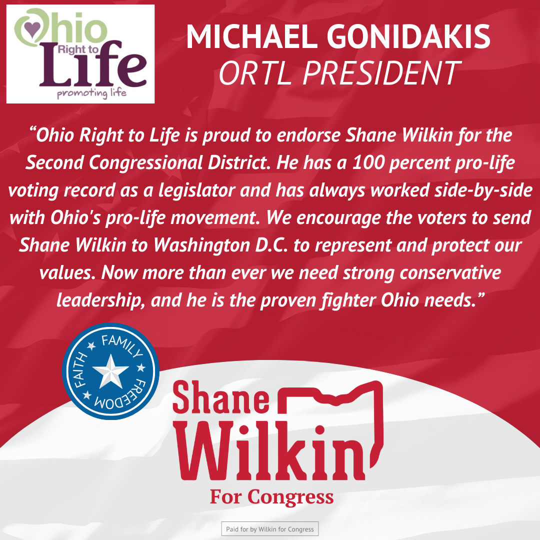 “Ohio Right to Life is proud to endorse Shane Wilkin for the Second Congressional District. He has a 100 percent pro-life voting record as a legislator and has always worked side-by-side with Ohio's pro-life movement,” said Ohio Right to Life President Michael Gonidakis. “We encourage the voters to send Shane Wilkin to Washington D.C. to represent and protect our values. Now more than ever we need strong conservative leadership, and he is the proven fighter Ohio needs.”